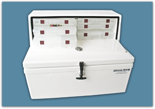 Frigid Rigid manufacturer of the world’s finest quality ice chests, introduces their new “Tackle Center Cooler.” The “Tackle Center” merges all the advantages of a 100 quart cooler; capable of keeping ice for up to 2 weeks, with a six drawer, fully enclosed tackle center mounted on the “set-back” portion of the top of the cooler.